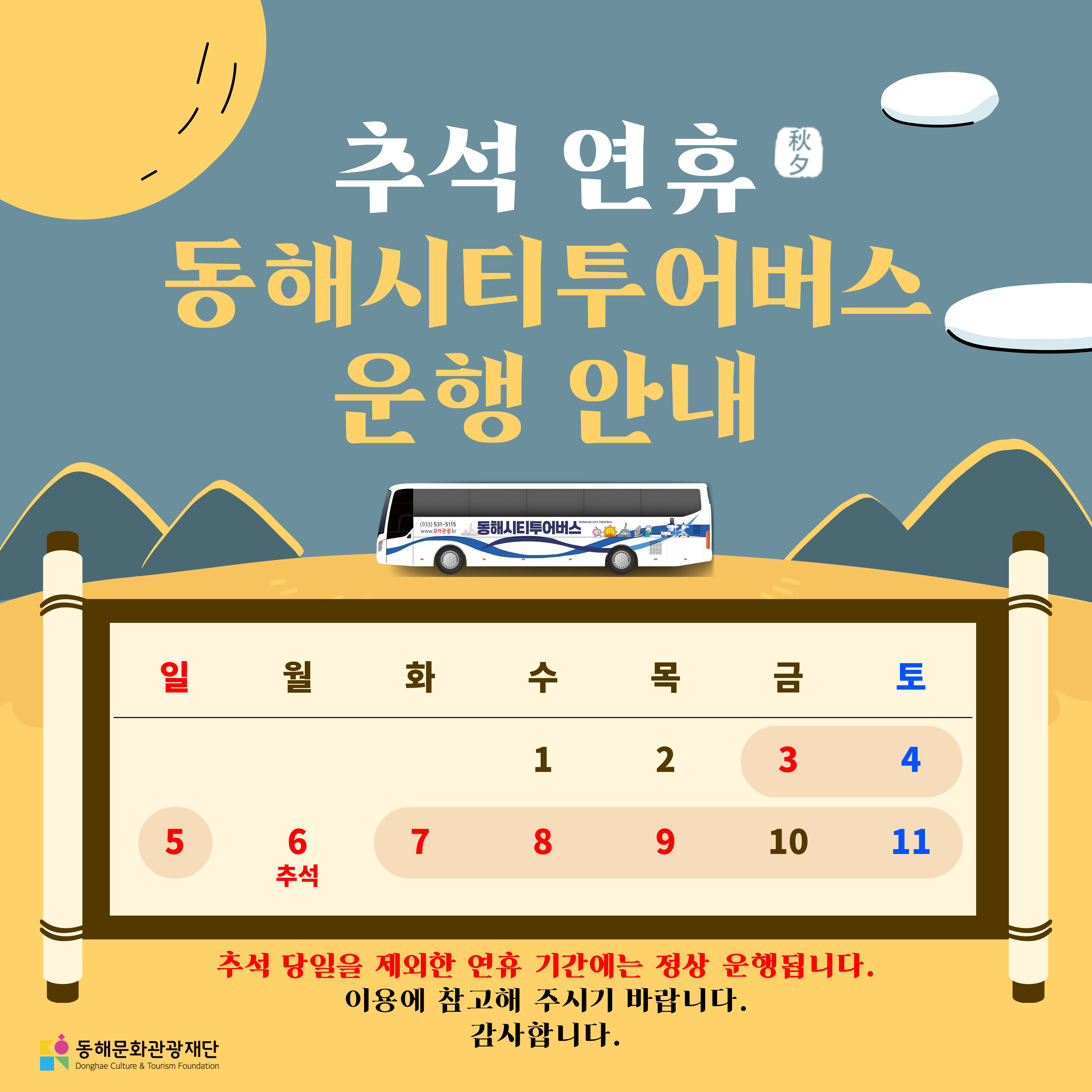 µ¿ÇØ½ÃÆ¼Åõ¾î¹ö½º´Â Ãß¼® ´çÀÏ(6ÀÏ, ¿ù) Á¦¿ÜÇÑ ¿¬ÈÞ ±â°£¿¡´Â Á¤»ó ¿îÇàµË´Ï´Ù. 10¿ù 3ÀÏ(°³ÃµÀý), 10ÀÏ(¡¦